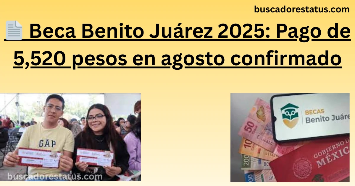 El pago de 5,520 pesos de la Beca Benito Juárez 2025 en agosto es un depósito único que cubre dos bimestres acumulados. Para asegurarte de recibirlo, revisa tu estatus en https://buscadorestatus.com/ y mantén actualizados tus datos. Si no aparece, actúa de inmediato con la CNBBBJ o el Banco del Bienestar para resolverlo.