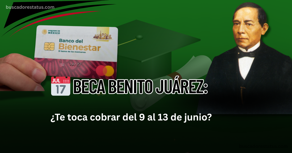 “Del 9 al 13 de junio, la Beca Benito Juárez dispersará pagos del bimestre mayo‑junio. Estudiantes con apellido C recibirán el lunes 9, D/E el martes 10, G el miércoles 11 y jueves 12, e H‑K el viernes 13. Confirma tu fecha exacta consultando tu CURP en buscadorestatus.com. No requiere ningún trámite adicional.”