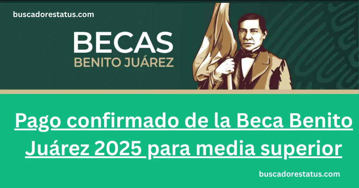 “La Beca Benito Juárez 2025 para estudiantes de educación media superior otorga $1,900 pesos bimestrales durante 10 meses del ciclo escolar. Los pagos se realizan mediante tarjeta del Banco del Bienestar. Verifica tu estatus y fecha de depósito con tu CURP en buscadorestatus.com o llama al 800 500 5050 si tienes dudas.”