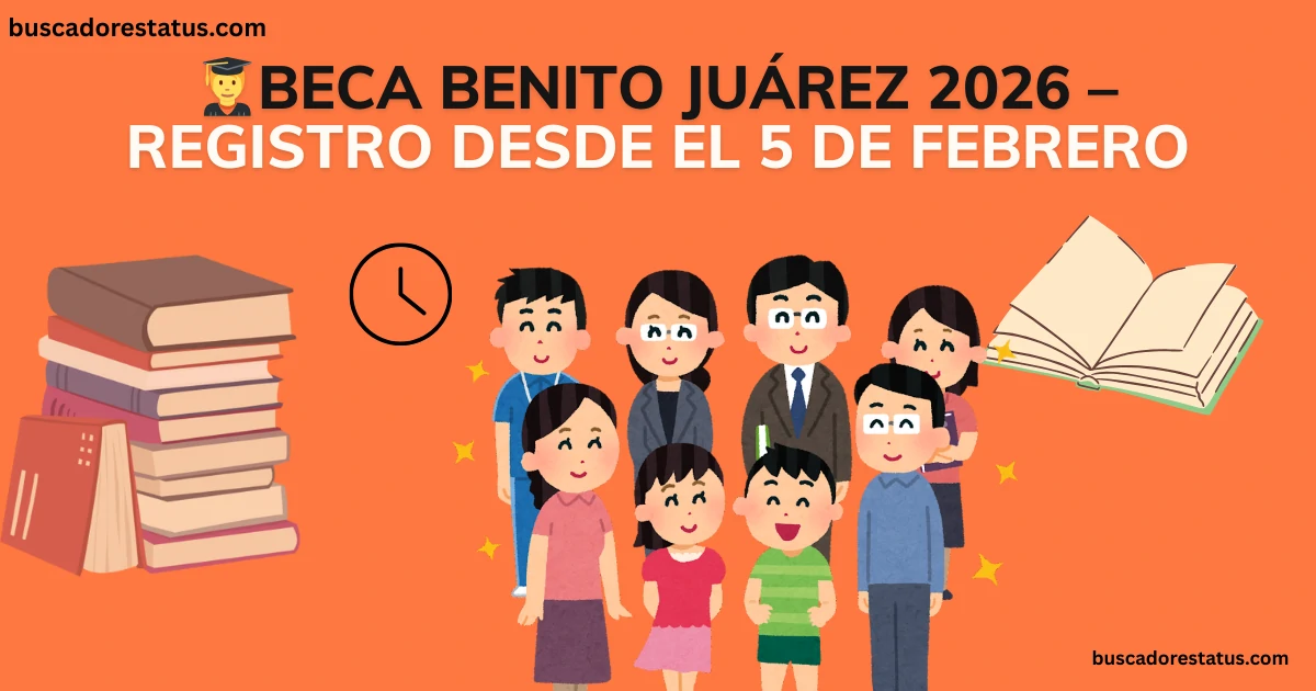 El registro para la Beca Benito Juárez 2026 comienza el 5 de febrero a las 14:00 horas en el portal oficial de becas. Estudiantes de nivel medio superior deben preparar su CURP, documentos escolares y comprobante de domicilio. Consulta tu estatus en https://buscadorestatus.com. El apoyo es de $1,900 bimestrales para quienes cumplan todos los requisitos.